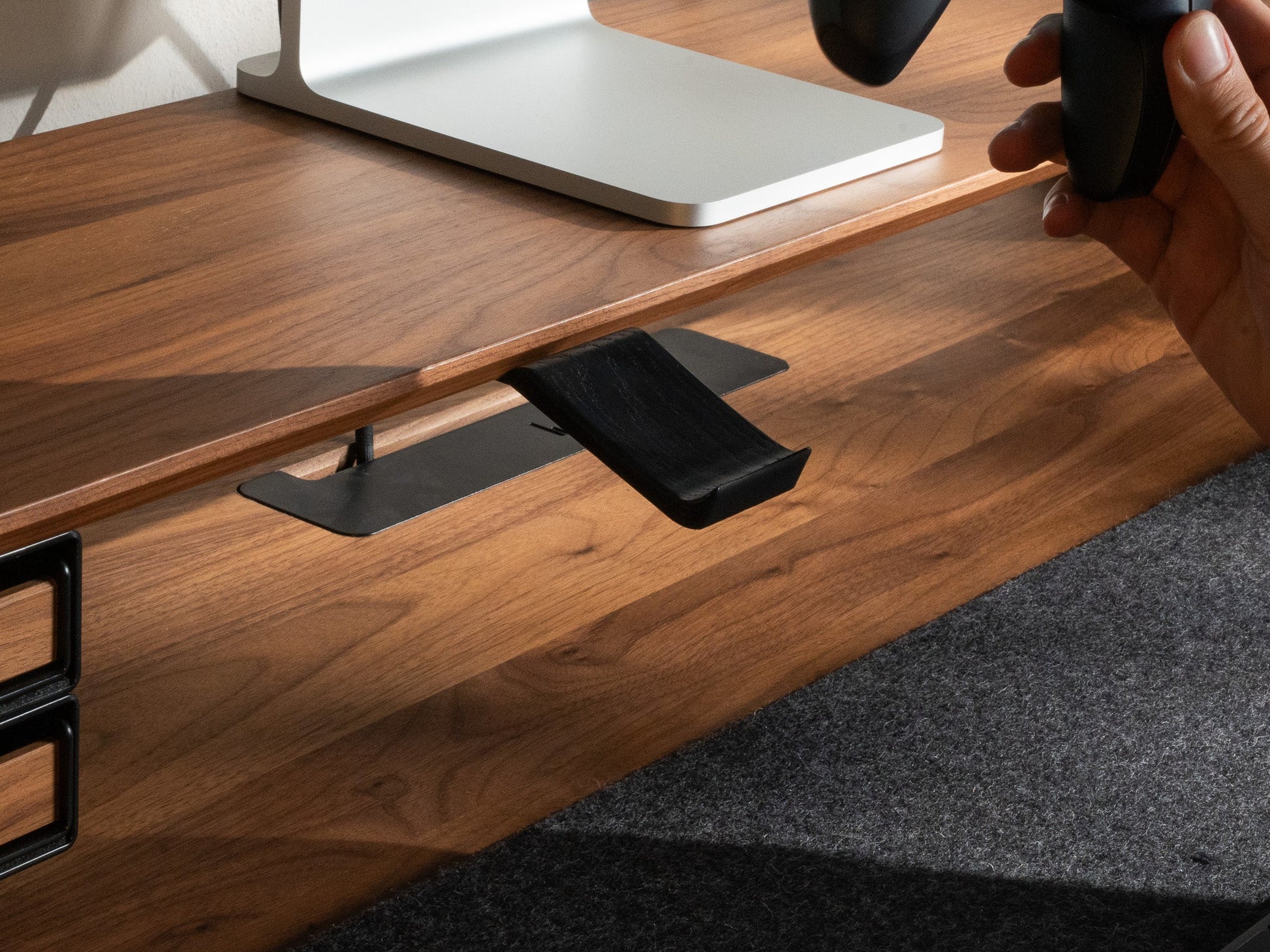 In seiner Funktionalität perfektioniert wird das Setup Cockpit durch eine Reihe modularer Zubehörteile. Diese können an den Montagepunkten des geschützten Montagerasters auf der Unterseite individuell angebracht werden. So wird das fließende Zusammenspiel zwischen Laptop, Smartphone, Kopfhörer und co. zu einer wahren Genugtuung. Für das Extra an Support bei mehreren oder besonders schweren Monitoren, kann der optionale Stützfuß mittig am Montageraster angebracht werden.