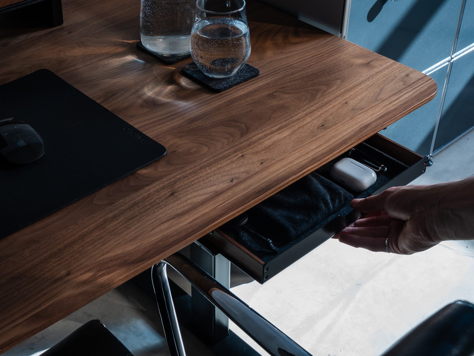 In seiner Funktionalität perfektioniert wird das Setup Cockpit durch eine Reihe modularer Zubehörteile. Diese können an den Montagepunkten des geschützten Montagerasters auf der Unterseite individuell angebracht werden. So wird das fließende Zusammenspiel zwischen Laptop, Smartphone, Kopfhörer und co. zu einer wahren Genugtuung. Für das Extra an Support bei mehreren oder besonders schweren Monitoren, kann der optionale Stützfuß mittig am Montageraster angebracht werden.