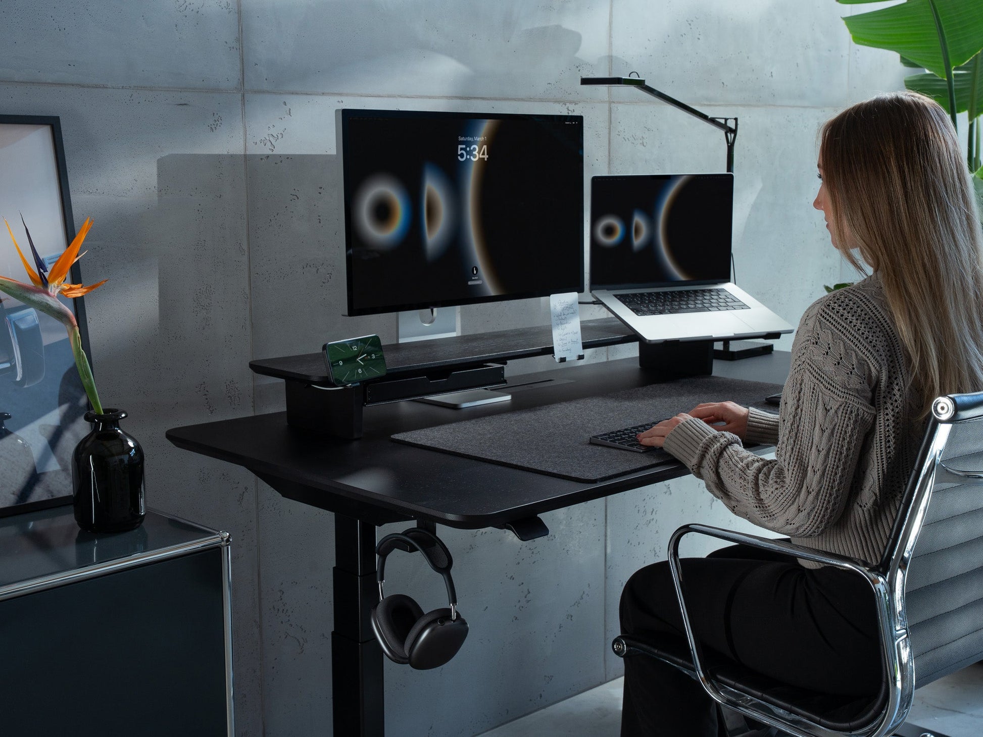 Unsere Bildschirmerhöhung ist präzise und hochwertig verarbeitet. Das durchdachte und minimalistische Design fügt sich in jede Arbeitsumgebung, ob Homeoffice oder Büro, perfekt ein. Es verwandelt jedes Schreibtisch Setup in ein Unikat und schafft dabei ein neues Arbeitsgefühl mit dem individuell anpassbaren Monitorständer Setup Cockpit.