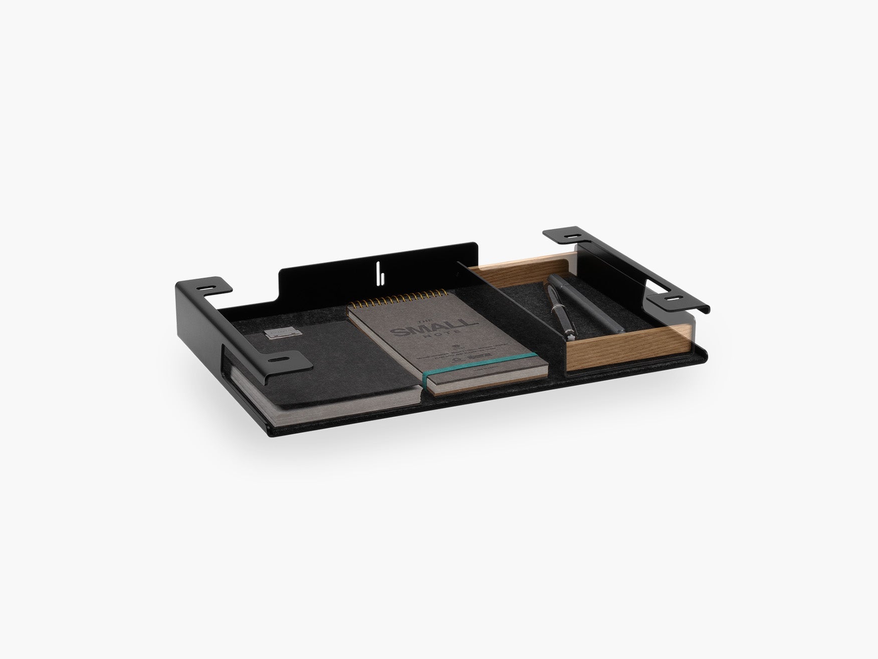 In seiner Funktionalität perfektioniert wird das Setup Cockpit durch eine Reihe modularer Zubehörteile. Diese können an den Montagepunkten des geschützten Montagerasters auf der Unterseite individuell angebracht werden. So wird das fließende Zusammenspiel zwischen Laptop, Smartphone, Kopfhörer und co. zu einer wahren Genugtuung. Für das Extra an Support bei mehreren oder besonders schweren Monitoren, kann der optionale Stützfuß mittig am Montageraster angebracht werden.
