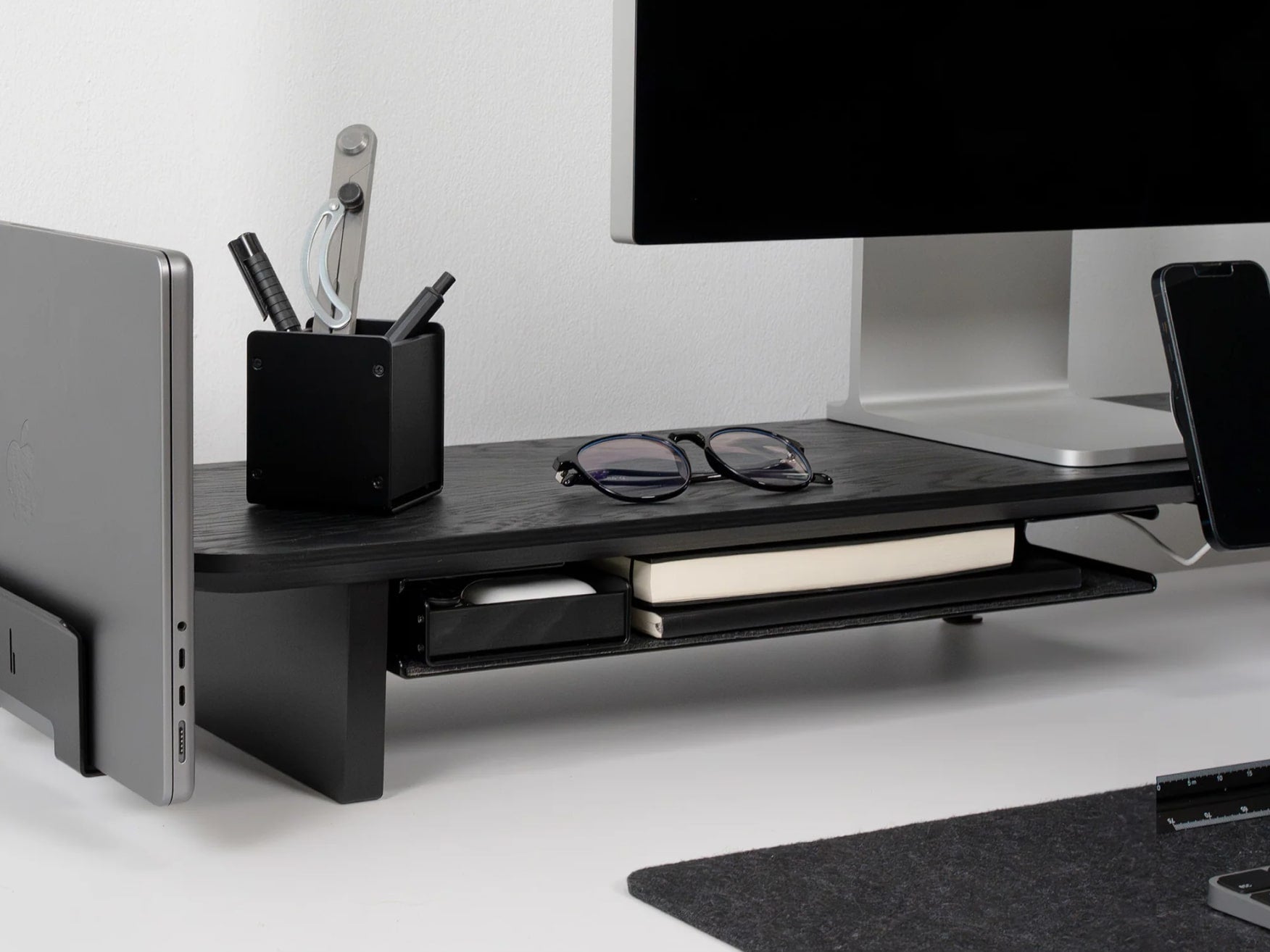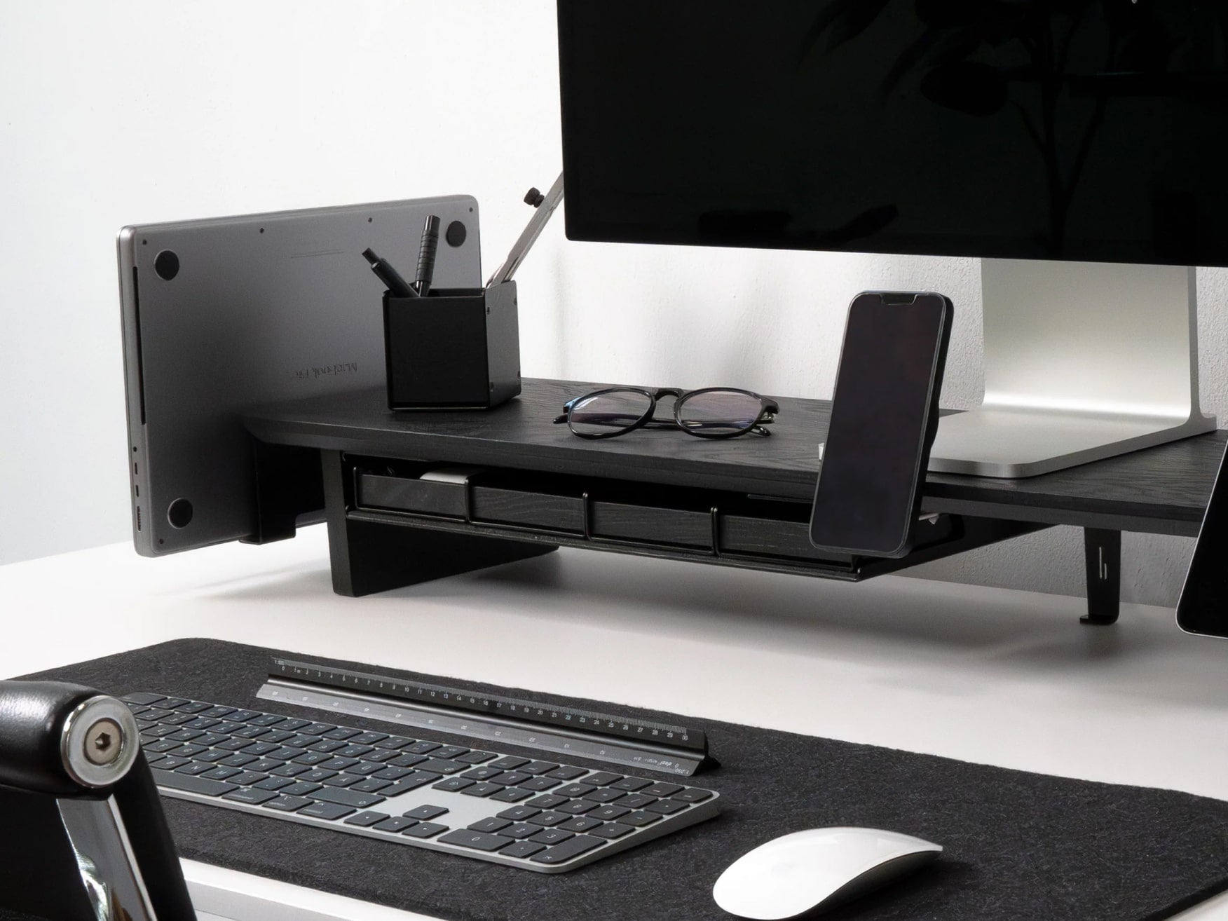 Unsere Bildschirmerhöhung ist präzise und hochwertig verarbeitet. Das durchdachte und minimalistische Design fügt sich in jede Arbeitsumgebung, ob Homeoffice oder Büro, perfekt ein. Es verwandelt jedes Schreibtisch Setup in ein Unikat und schafft dabei ein neues Arbeitsgefühl mit dem individuell anpassbaren Monitorständer Setup Cockpit.