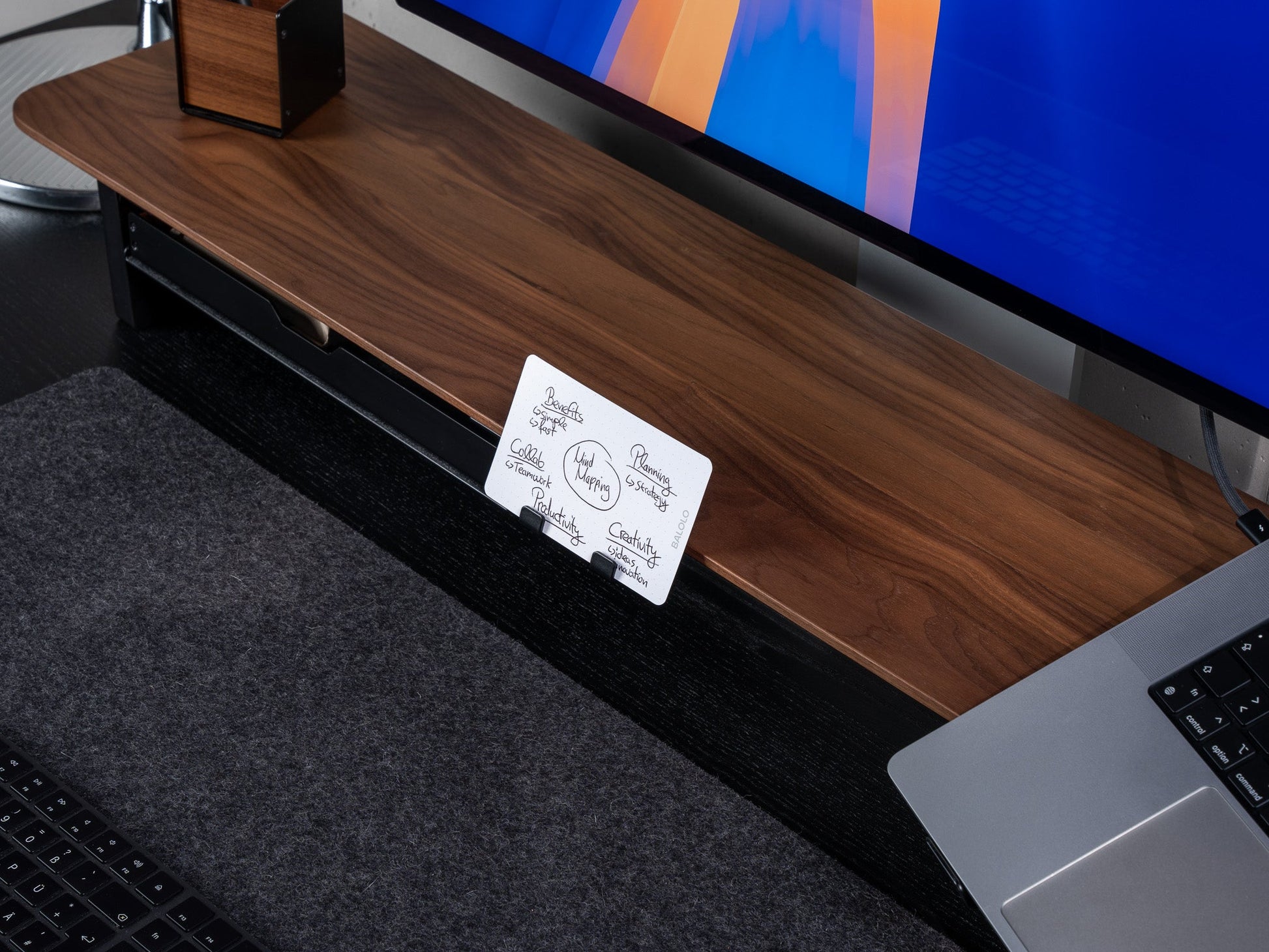 Das BALOLO® Setup Cockpit verbindet Ästhetik und Funktionalität. Die Monitorerhöhung hebt den Bildschirm auf eine ergonomische Höhe. Mit seinem minimalistischen Design wird es in jedem Schreibtisch-Setup zum Statement und erschafft ein neues Level von Struktur und Ordnung.