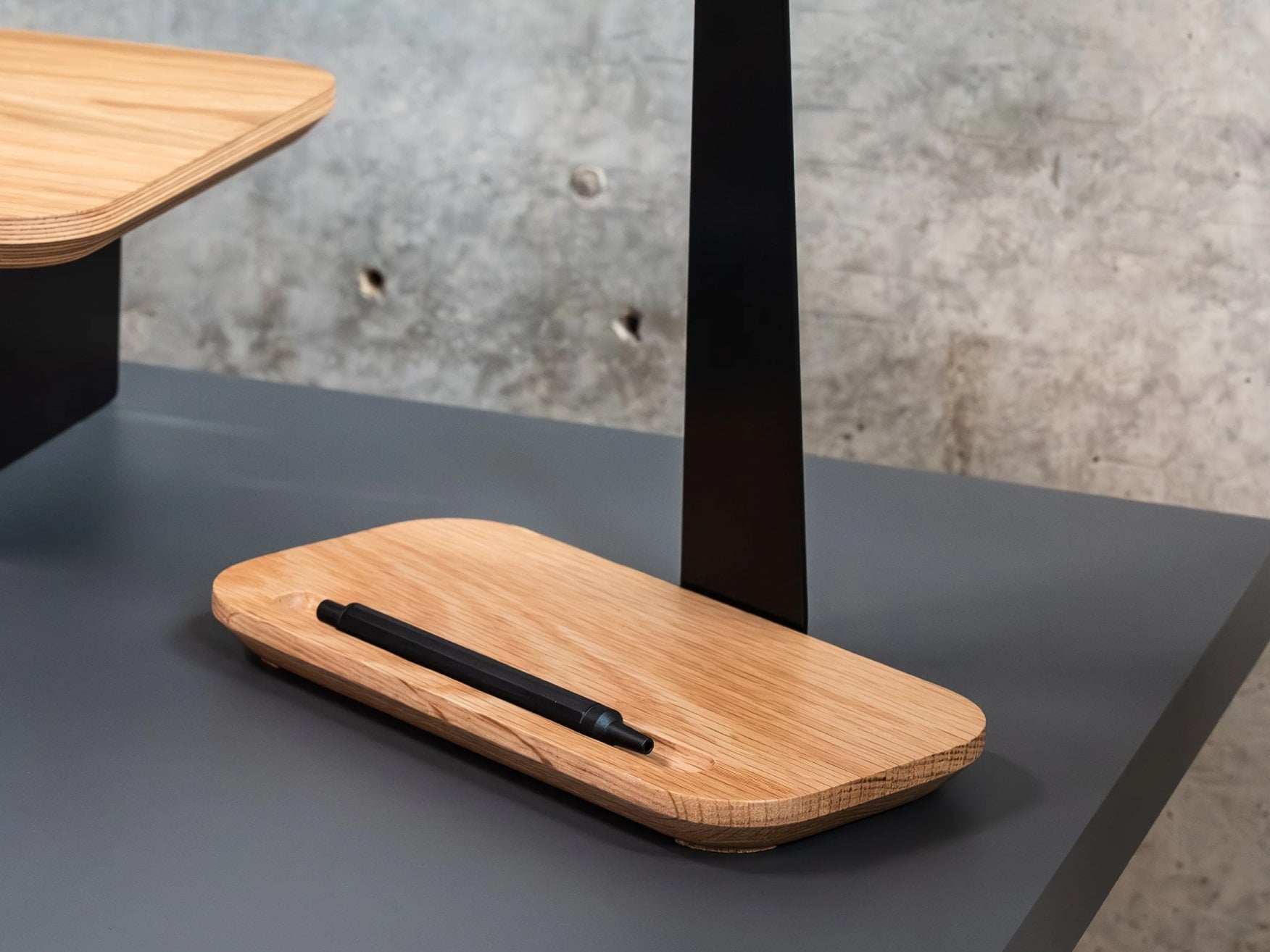 In seiner Funktionalität perfektioniert wird das Setup Cockpit durch eine Reihe modularer Zubehörteile. Diese können an den Montagepunkten des geschützten Montagerasters auf der Unterseite individuell angebracht werden. So wird das fließende Zusammenspiel zwischen Laptop, Smartphone, Kopfhörer und co. zu einer wahren Genugtuung. Für das Extra an Support bei mehreren oder besonders schweren Monitoren, kann der optionale Stützfuß mittig am Montageraster angebracht werden.