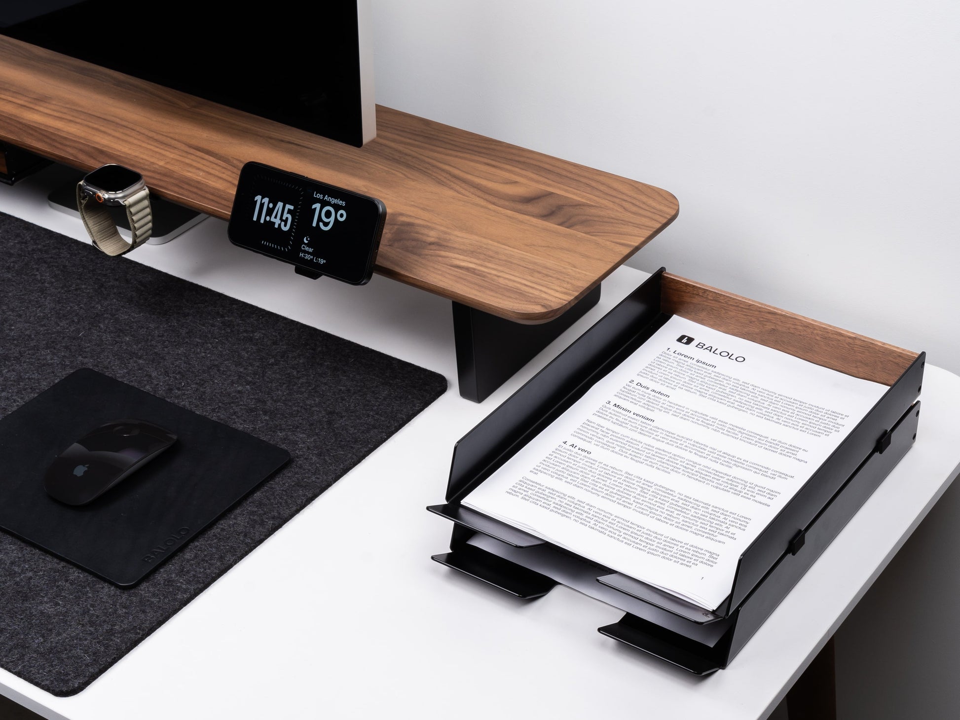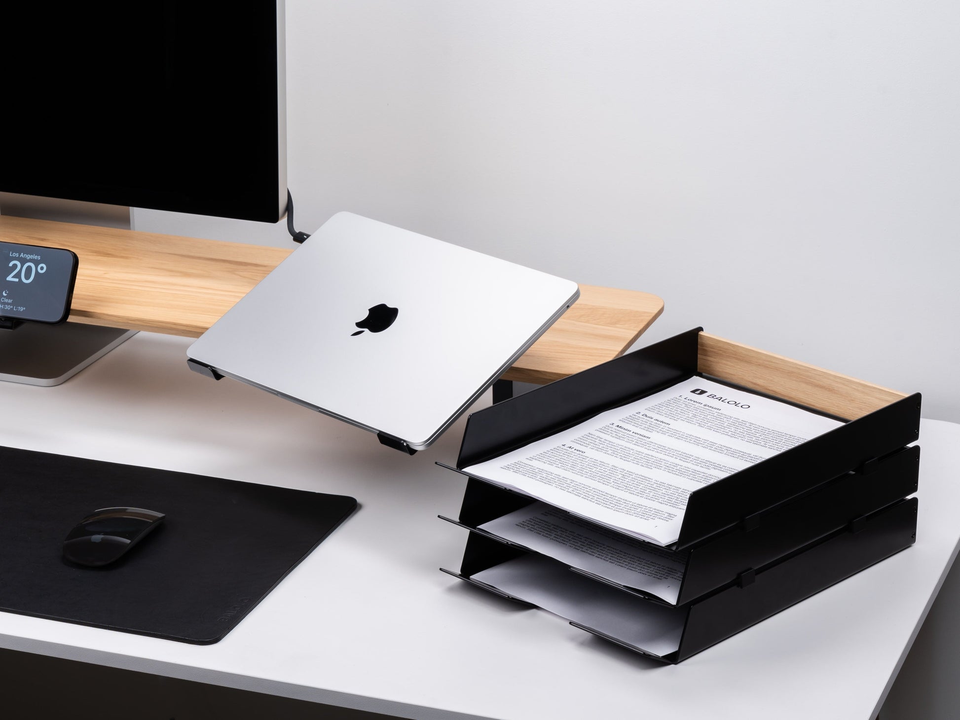 Das BALOLO® Setup Cockpit verbindet Ästhetik und Funktionalität. Die Monitorerhöhung hebt den Bildschirm auf eine ergonomische Höhe. Mit seinem minimalistischen Design wird es in jedem Schreibtisch-Setup zum Statement und erschafft ein neues Level von Struktur und Ordnung.