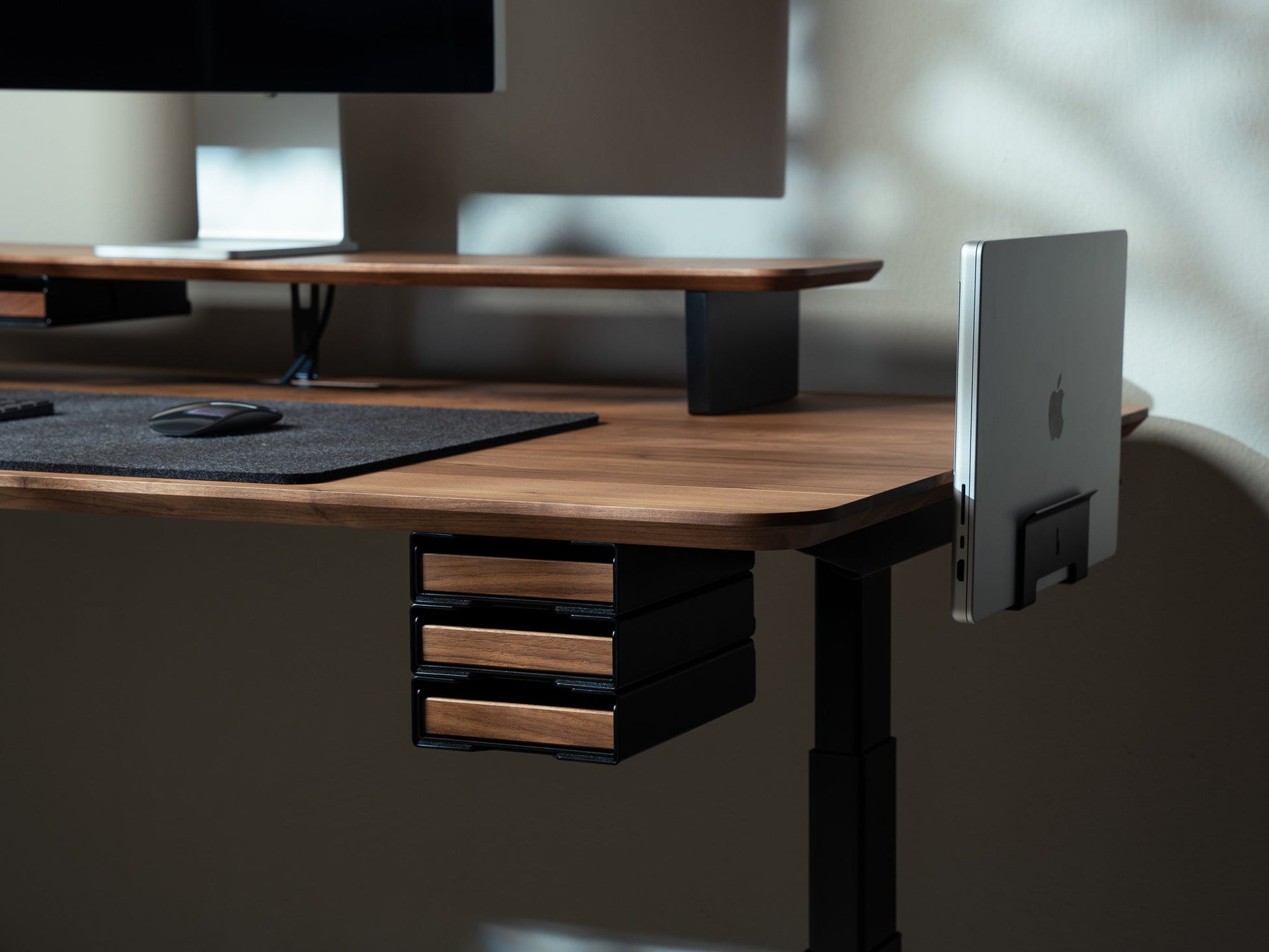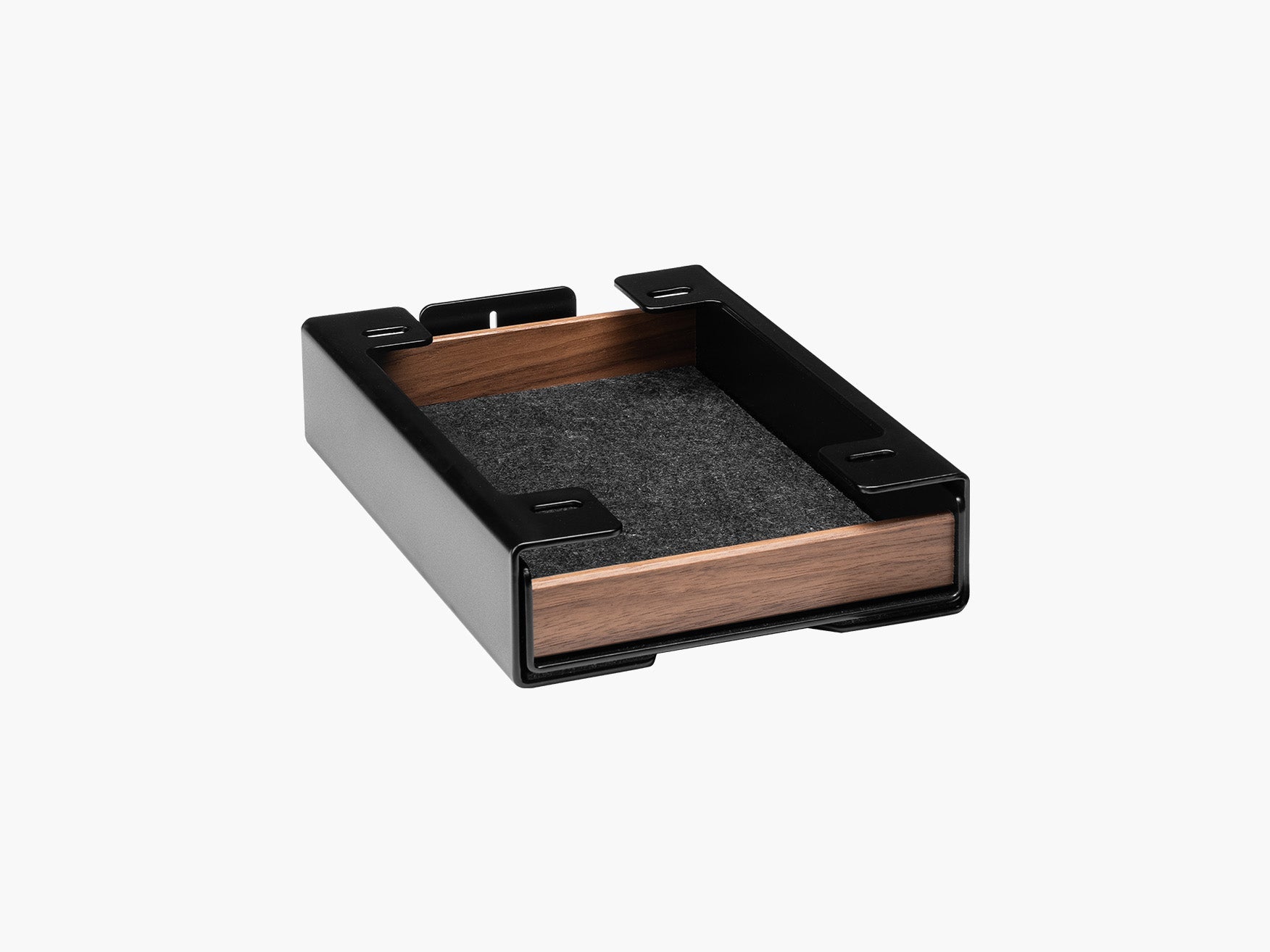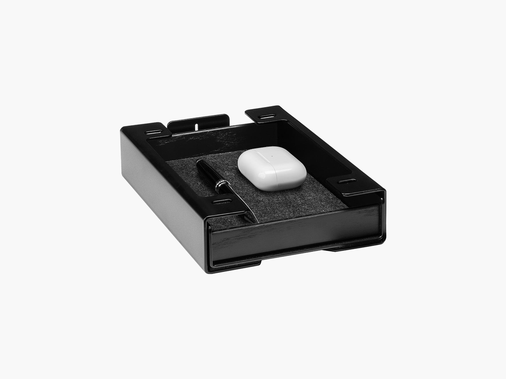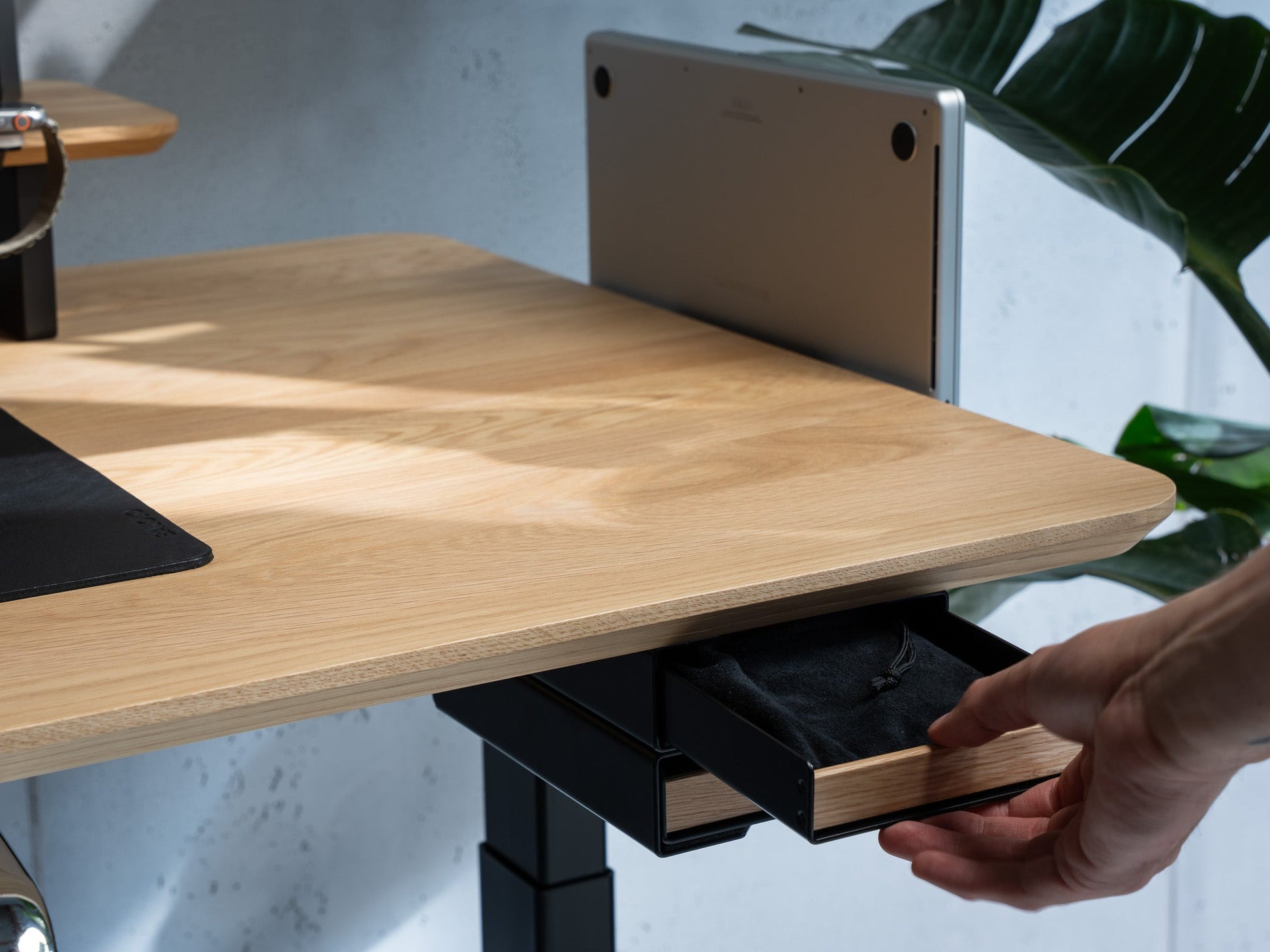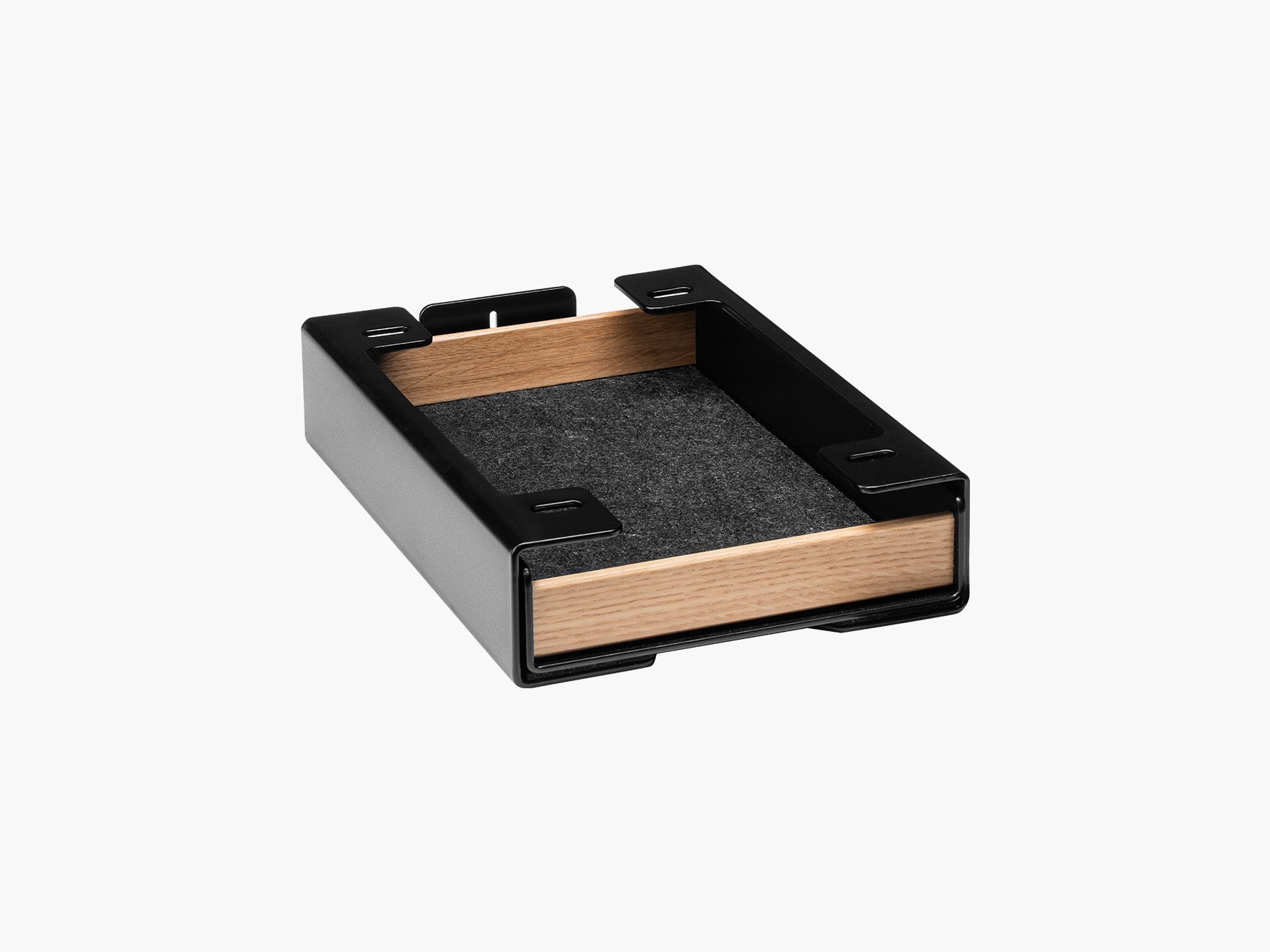 In seiner Funktionalität perfektioniert wird das Setup Cockpit durch eine Reihe modularer Zubehörteile. Diese können an den Montagepunkten des geschützten Montagerasters auf der Unterseite individuell angebracht werden. So wird das fließende Zusammenspiel zwischen Laptop, Smartphone, Kopfhörer und co. zu einer wahren Genugtuung. Für das Extra an Support bei mehreren oder besonders schweren Monitoren, kann der optionale Stützfuß mittig am Montageraster angebracht werden.