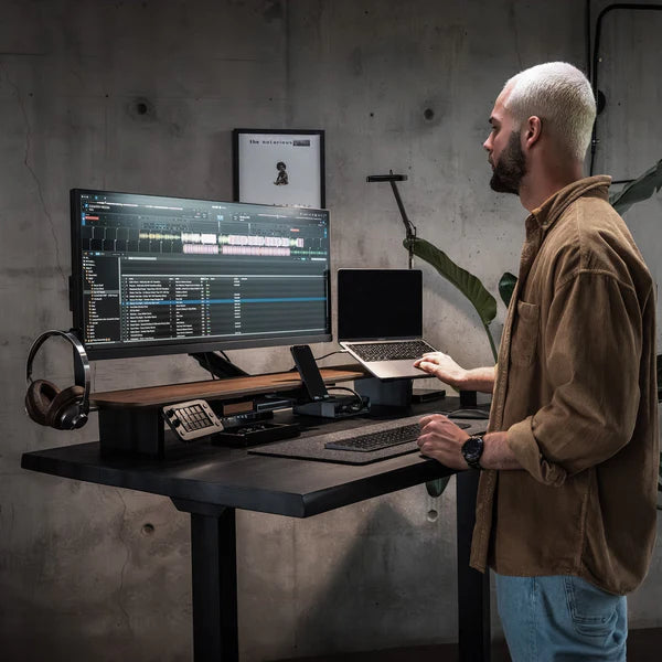 Unsere Bildschirmerhöhung ist präzise und hochwertig verarbeitet. Das durchdachte und minimalistische Design fügt sich in jede Arbeitsumgebung, ob Homeoffice oder Büro, perfekt ein. Es verwandelt jedes Schreibtisch Setup in ein Unikat und schafft dabei ein neues Arbeitsgefühl mit dem individuell anpassbaren Monitorständer Setup Cockpit.