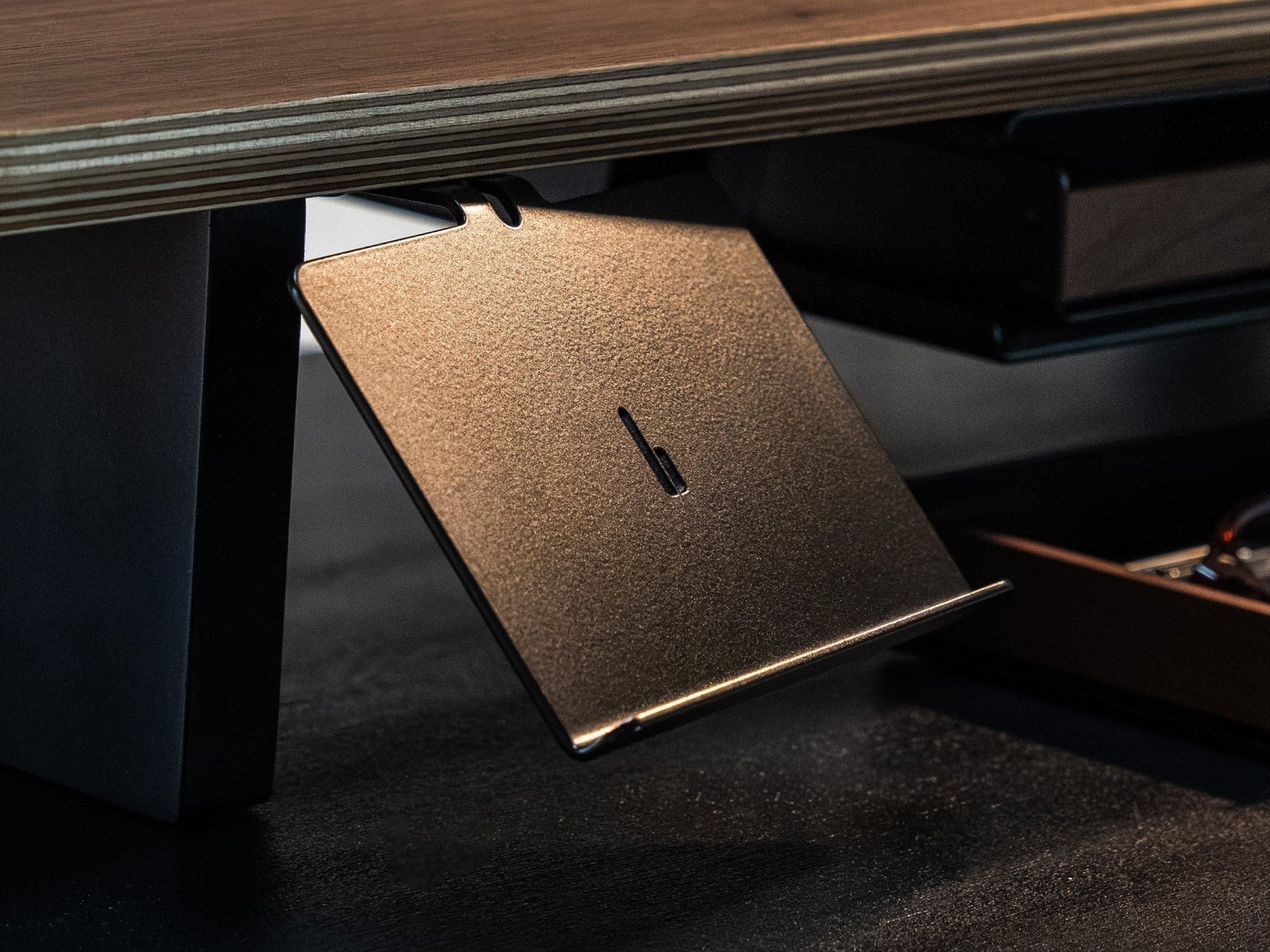 In seiner Funktionalität perfektioniert wird das Setup Cockpit durch eine Reihe modularer Zubehörteile. Diese können an den Montagepunkten des geschützten Montagerasters auf der Unterseite individuell angebracht werden. So wird das fließende Zusammenspiel zwischen Laptop, Smartphone, Kopfhörer und co. zu einer wahren Genugtuung. Für das Extra an Support bei mehreren oder besonders schweren Monitoren, kann der optionale Stützfuß mittig am Montageraster angebracht werden.