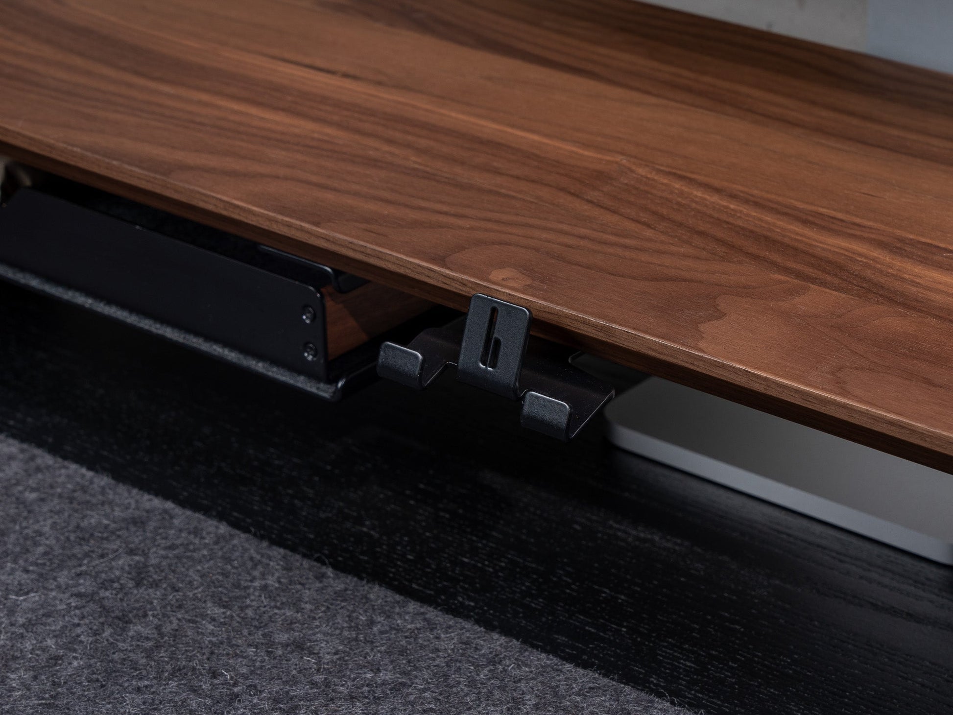 In seiner Funktionalität perfektioniert wird das Setup Cockpit durch eine Reihe modularer Zubehörteile. Diese können an den Montagepunkten des geschützten Montagerasters auf der Unterseite individuell angebracht werden. So wird das fließende Zusammenspiel zwischen Laptop, Smartphone, Kopfhörer und co. zu einer wahren Genugtuung. Für das Extra an Support bei mehreren oder besonders schweren Monitoren, kann der optionale Stützfuß mittig am Montageraster angebracht werden.