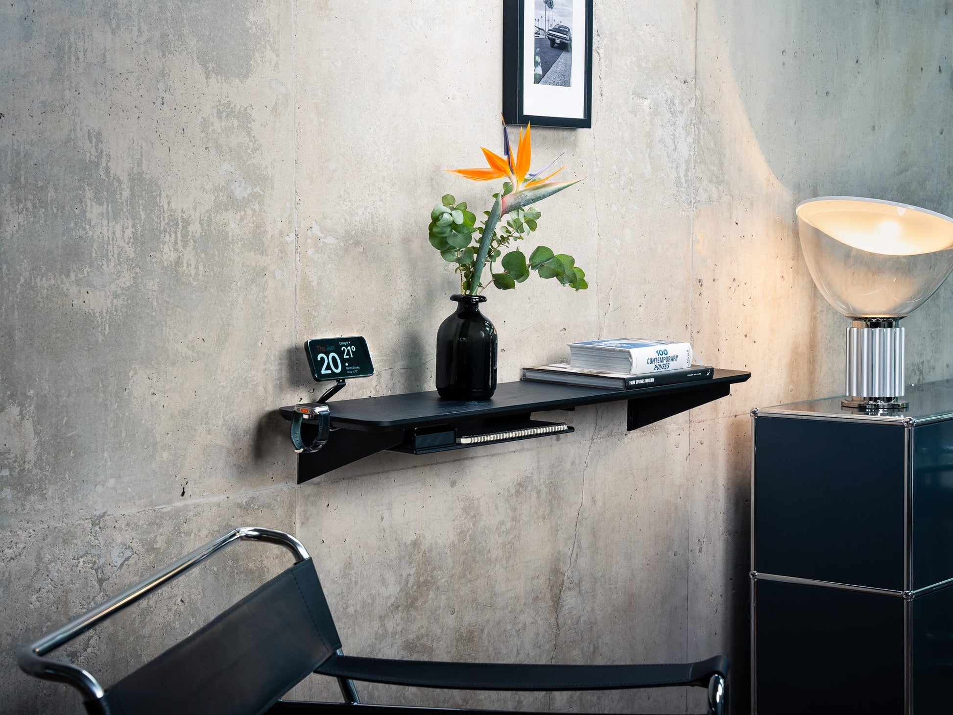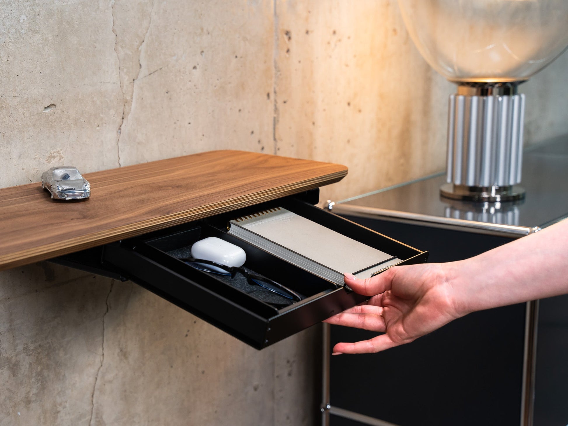 In seiner Funktionalität perfektioniert wird das Setup Cockpit durch eine Reihe modularer Zubehörteile. Diese können an den Montagepunkten des geschützten Montagerasters auf der Unterseite individuell angebracht werden. So wird das fließende Zusammenspiel zwischen Laptop, Smartphone, Kopfhörer und co. zu einer wahren Genugtuung. Für das Extra an Support bei mehreren oder besonders schweren Monitoren, kann der optionale Stützfuß mittig am Montageraster angebracht werden.